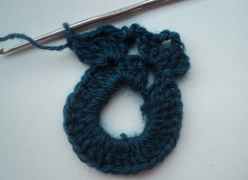 Набираем 2 ВП и вяжем во вторую 5 СБН (можно сделать скользящую петлю и в нее связать столбики), замыкаем в круг, соединяя последний столбик с 1-й воздушной петлей, и такое соединение выполняем в конце каждого ряда.