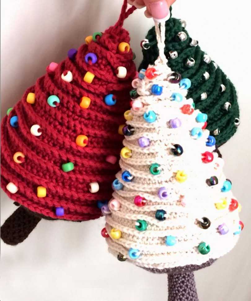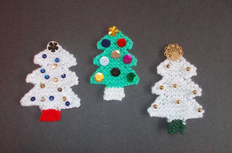 А если при вязании совмещать основную нить с люрексом или нанизывать мелкие бусинки или бисер, то получится эффект наряженной елки.