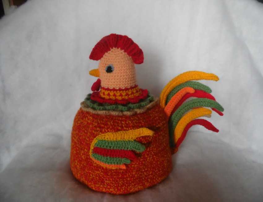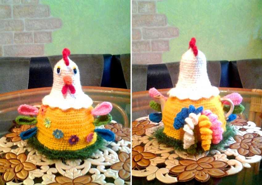 Получившиеся пышные цветы пришить на верхушку грелки для чайника, а нижний край грелки провязать рюшами. Грелка готова!Грелка-курочка в платье. Довольно часто грелки для чайников делают в форме животных, и лидируют почему-то, именно курицы и петухи. Что ж, связать такую красоту не так уж сложно, особенно, если есть описание и фото процесса. Для работы потребуется: