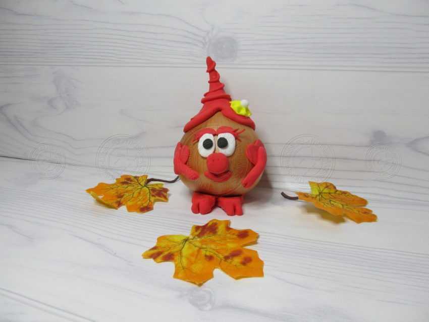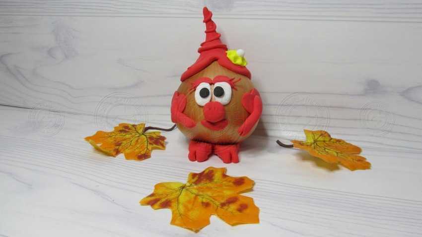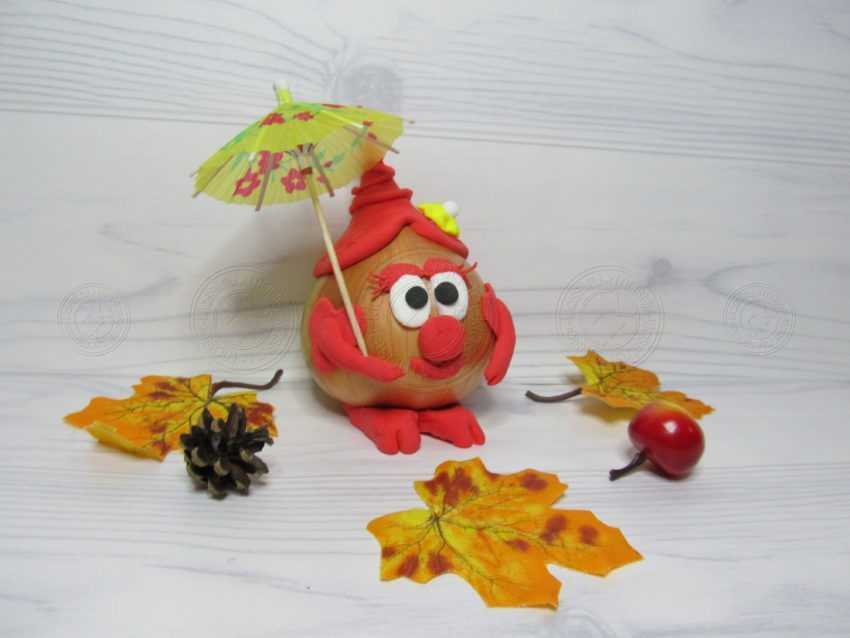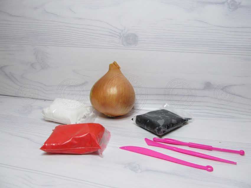 1. Возьмем для данной поделки луковицу, которая есть практически в каждом доме. Ее размер определите самостоятельно. Чем крупнее она будет, тем больше вам понадобится пластилина для ее отделки. Мы взяли овощ среднего размера, что советуем сделать и вам. Потрогайте ее, и определите, нет ли вмятин и мягких сторон. Если они присутствуют, значит луковица уже не свежая и стоит выбрать другую.