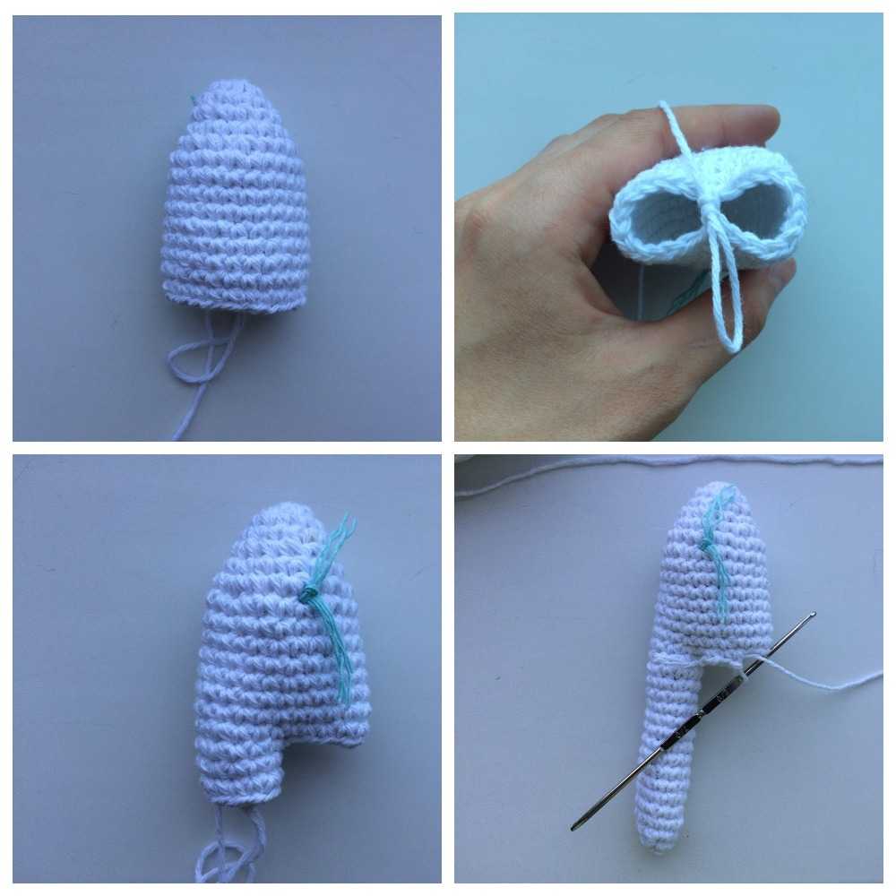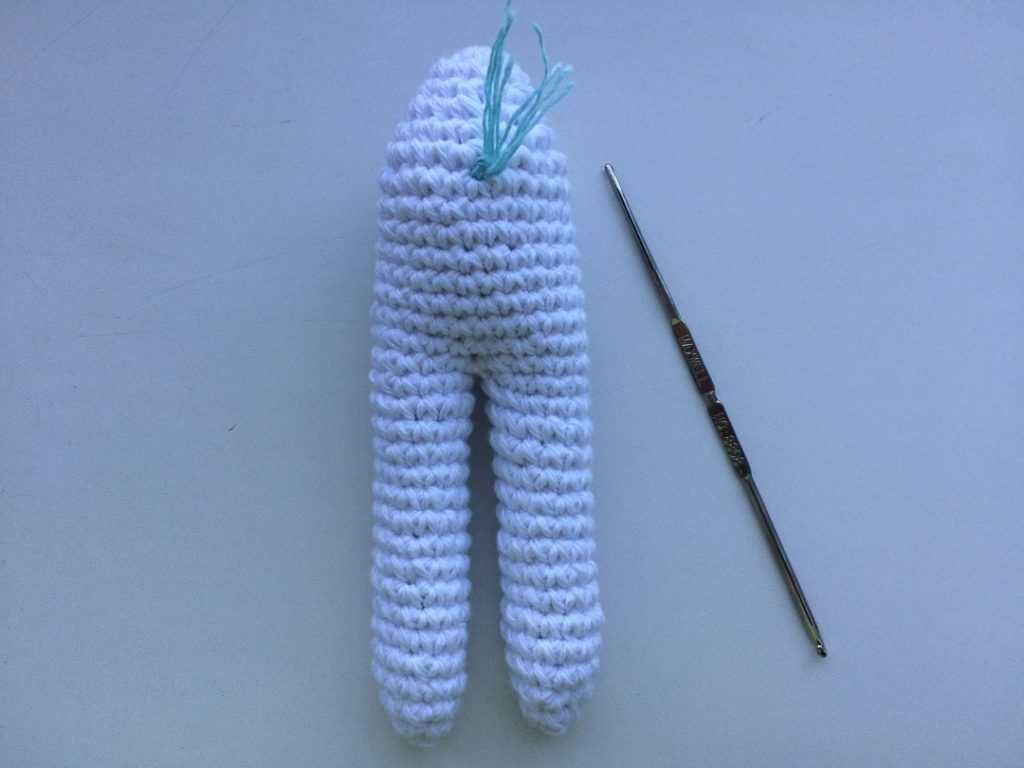 Теперь я вяжу одну ножку, затем закреплю нить и вернусь ко второй.