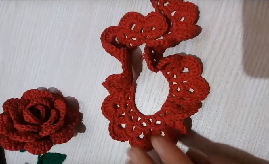 - Далее перейти на следующей ряд по этой же схеме вязания розы крючком и 10 ССН в ярку из ВП, после чего провязать 1 ВП и сделать ПС в ССН от ПР, повторить раппорт еще раз.