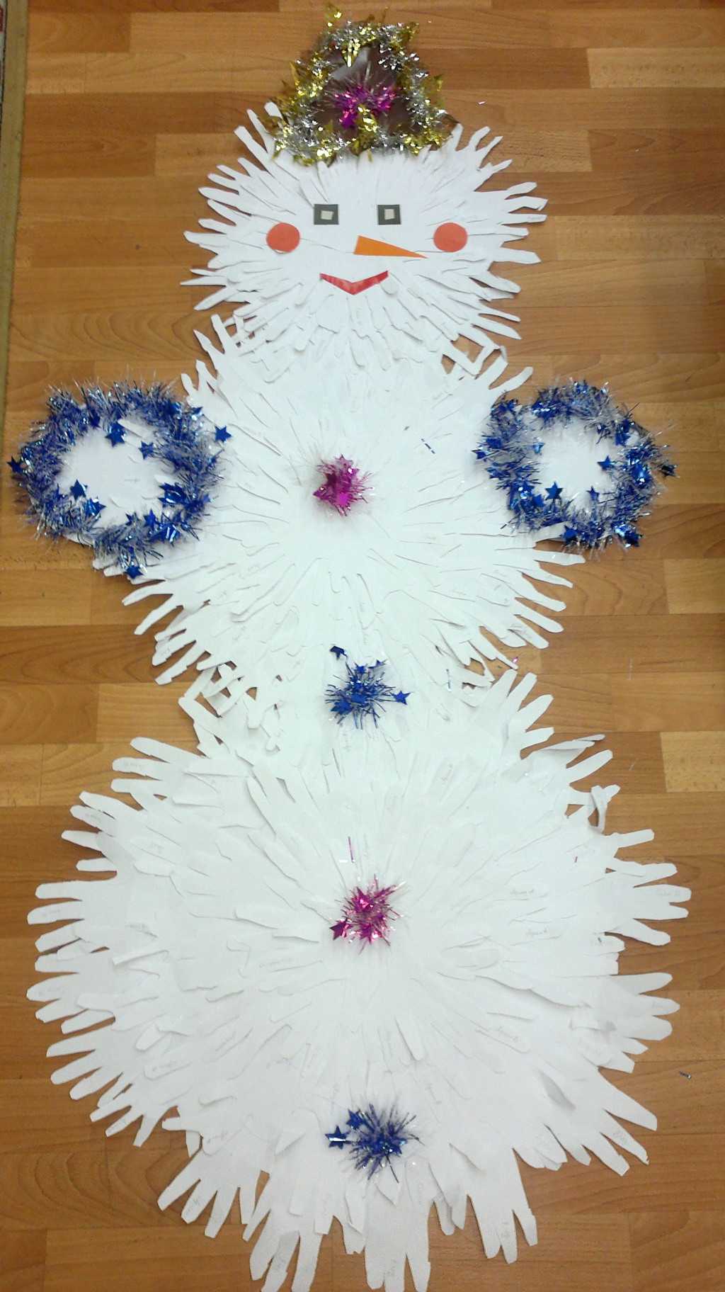 Снеговик из детских ладошек. Несложное задание, которое под силу выполнить каждому ребенку. С таким заданием малыши получат еще и массу удовольствий. В игровой форме воспитатель собирает обрисованные детками ладошки, вырезает их и крепит к общему снеговику. Такую фигуру можно поставить на вход раздевалки или в актовый зал, где проводятся утренники.