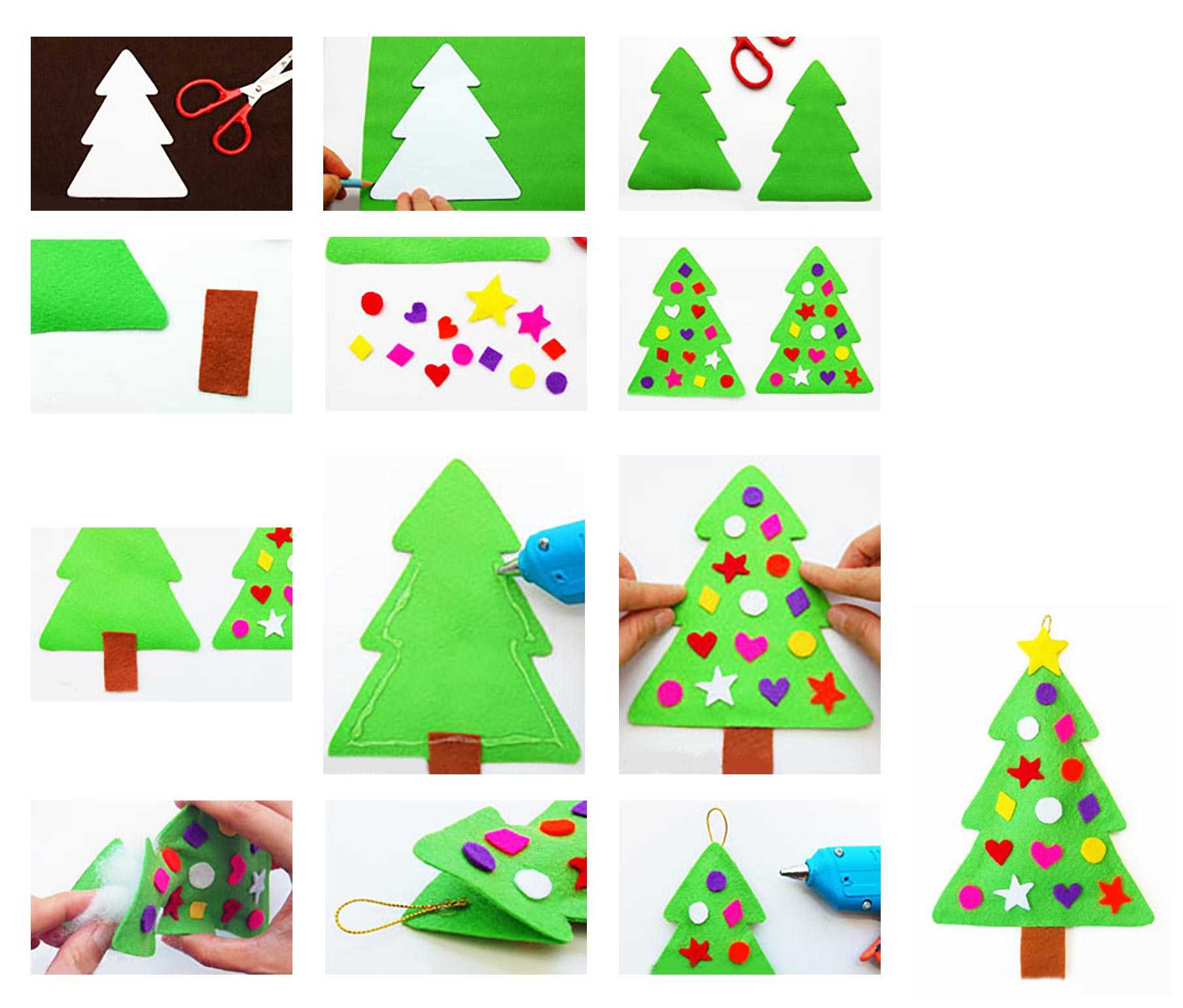 Ель с игрушками (поделка для старшей группы). Воспитатели раздают детям заранее подготовленные картонные шаблоны дерева и ствола, украшения для елки. Дети обводят шаблоны по ткани зеленого цвета. Должно получиться 2 одинаковых деревца. Необходимо будет вырезать их. Из куска коричневой ткани вырезаем ствол дерева. На первую часть еловой заготовки приклеиваем ствол, сверху кладем вторую зеленую часть. Дерево до конца не приклеиваем, оставляем зазор на верхушке, всовываем туда синтепон и петельку. В завершение зашиваем ткань и клеим украшения для ели;