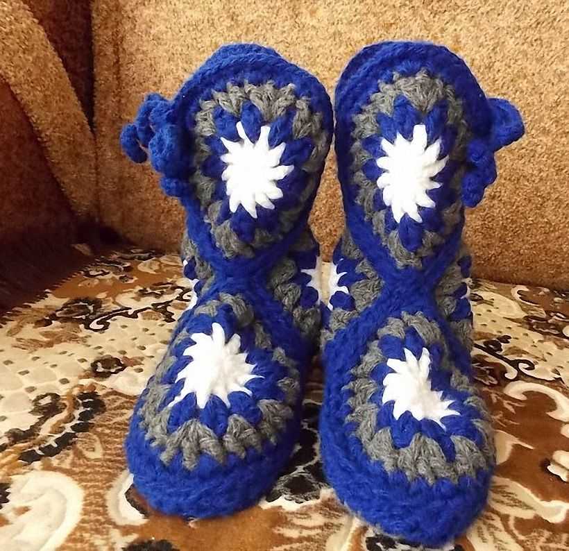 Тапочки-сапожки, это самая высокая домашняя обувь. Их вяжут с отворотами, с широкой верхней резинкой, с различными застежками. Они очень уместны в домах, где пол в зимнее время очень холодный. Защищают от простуды и обеспечивают уют ножкам.