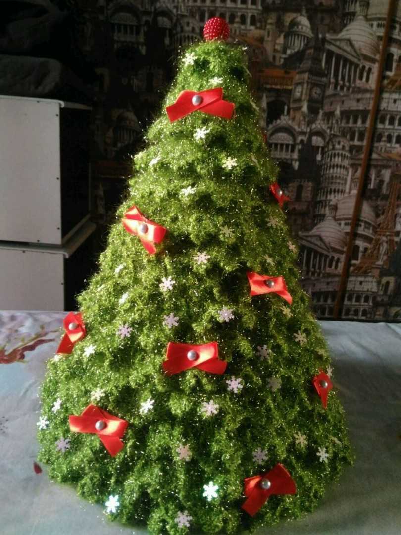 Елка получится такая же, как на изображении выше. Смотрится лесная красавица очень красиво, но если ее еще и нарядить, то она получится по-настоящему праздничной. Украшения можете придумывать на свой вкус. Начиная от серпантина, заканчивая бусами, бантиками и т.п.