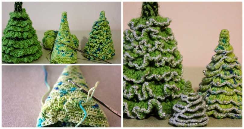 Необычно на новогодней елке будут смотреться вязаные елочки. Чтобы игрушки отлично контрастировали на фоне новогоднего дерева, выбирайте оттенки ниток, отличающиеся от цвета ели. Елочки вяжутся сочетанием мотивов, которые отличаются по размеру. Многие рукодельницы отдают предпочтение узору — бабушкин квадрат.