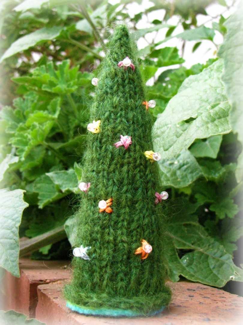 Елку на шампанское можно связать несколькими способами с использованием самых разных нитей. Например, пряжа «травка» подойдет для работы начинающим мастерицам. Чехол вяжут полу-столбиками, а пушистая структура волокна скроет незначительные огрехи.