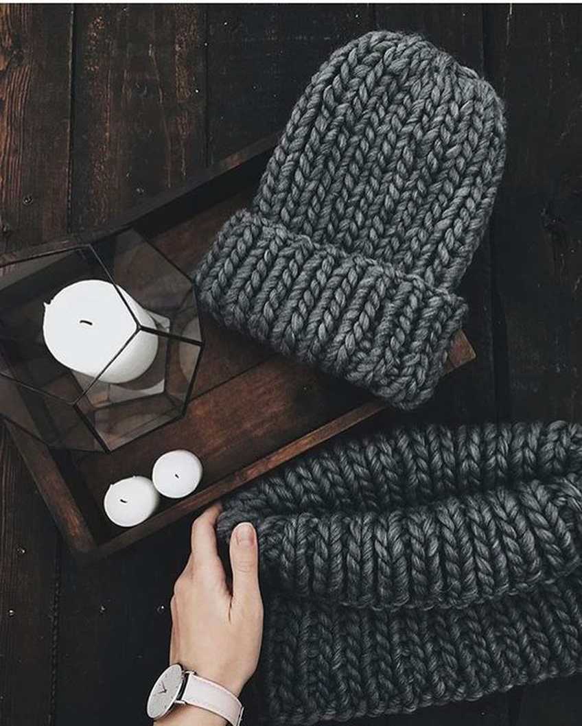 - шапка и снуд из толстых ниток, выполненные одним узор и в одной цветовой гамме;