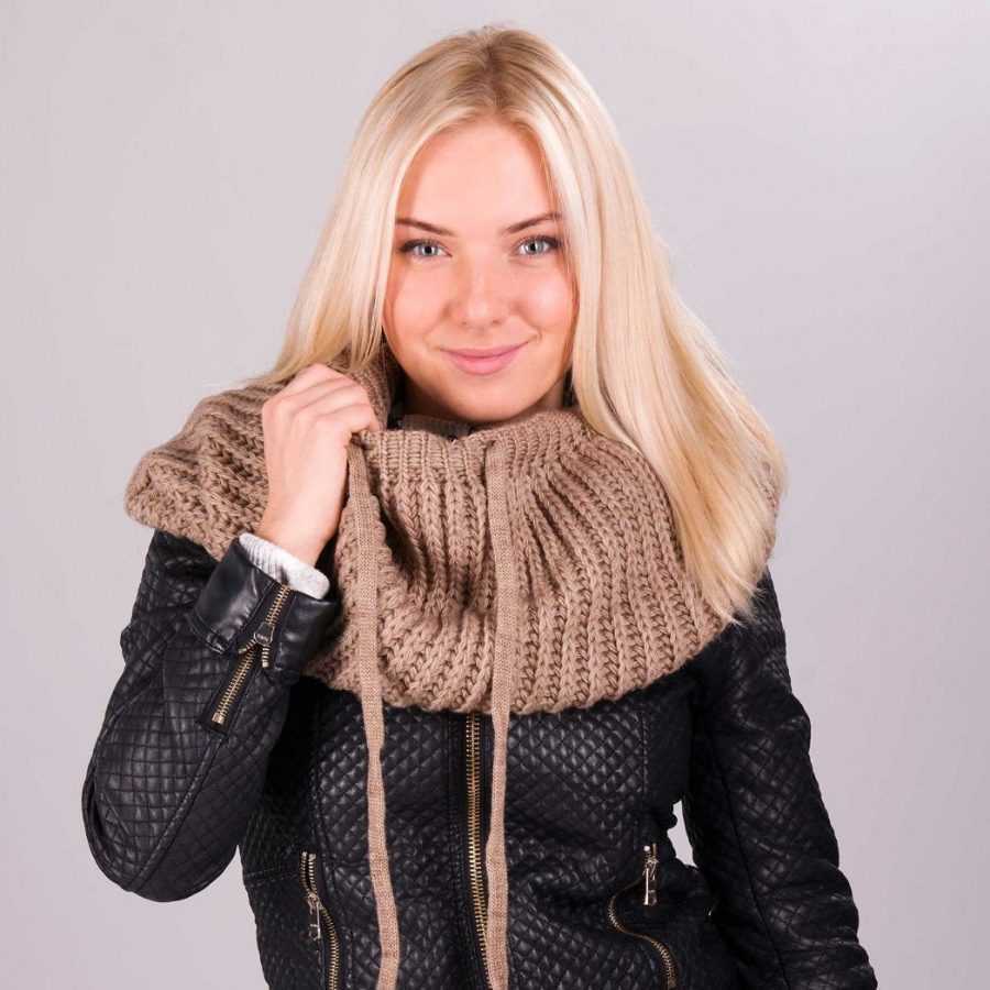 Еще одна модная модель шарфа, которую вяжут спицами — капюшон. Он также надевается через голову, но выглядит иначе. Этот аксессуар отлично дополнит куртку или пуховик, у которых нет капюшона, согреет в мороз и защитит от осадков.