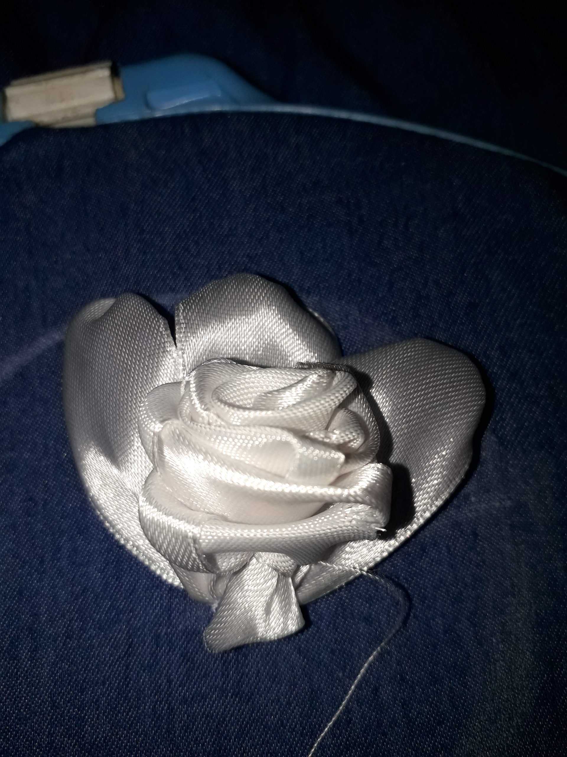 - Из лент 6 мм скручиваю маленькие розы и пришиваю их как полураспустившиеся бутоны.